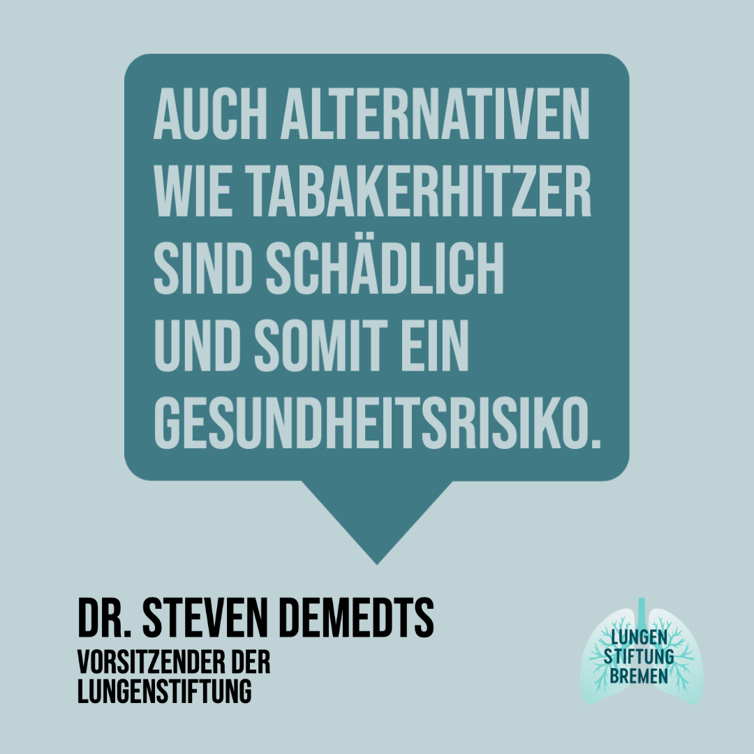 Viele Jahre war unter Jugendlichen die Zahl der Raucher rückläufig, das Qualmen galt bei den meisten als „out“. Laut der aktuellen „Deutschen Befragung zum Rauchverhalten“ (Debra) wird das Rauchen unter Jugendlichen zwischen 14- bis 17 Jahren seit vergangenem Jahr aber wieder beliebter. Neben der klassischen Zigarette würden längst auch vermeintlich gesündere Alternativen genutzt. Tabakerhitzer (sogenannte Heat-not-burn-Produkte) und Shishas spielen da mittlerweile eine große Rolle“, sagt Dr. Steven Demedts, Chefarzt der Lungenklinik am Klinikum Bremen-Ost und Vorsitzender der Lungenstiftung Bremen. Der Lungenmediziner warnt: „Auch die Alternativen sind schädlich und mit erheblichen gesundheitlichen Risiken verbunden.“