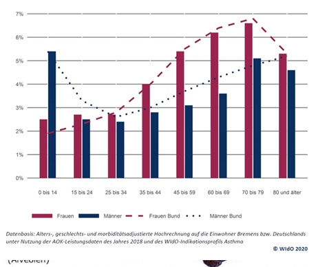 Auffällig sind in Bremen einige Ergebnisse der geschlechtsspezifischen Verteilung von Asthma: Bei Kindern und Jugendlichen bis zum 14. Lebensjahr sind Jungen häufiger als Mädchen betroffen. Im jugendlichen und im jungen Erwachsenenalter zeigt die Häufigkeit eine gleiche Verteilung. Im höheren Alter sind dann allerdings Frauen häufiger als Männer von Asthma betroffen, in der Gruppe der 70 bis 79-Jährigen entfällt in Bremen auf die Frauen eine Häufigkeit von 6,6 %, bei Männern auf rund 5 %.
